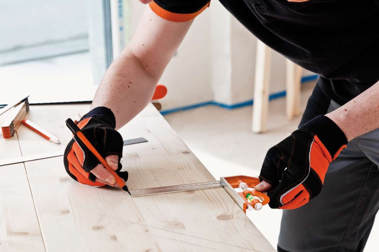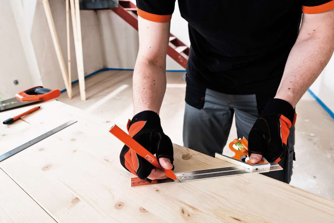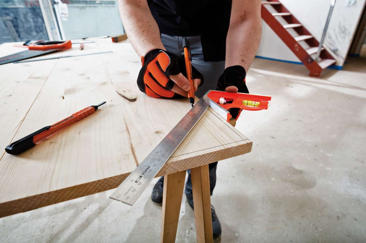 - Indbygget libelle til nivellering. Inkluderer en metalridsespids i håndtaget.