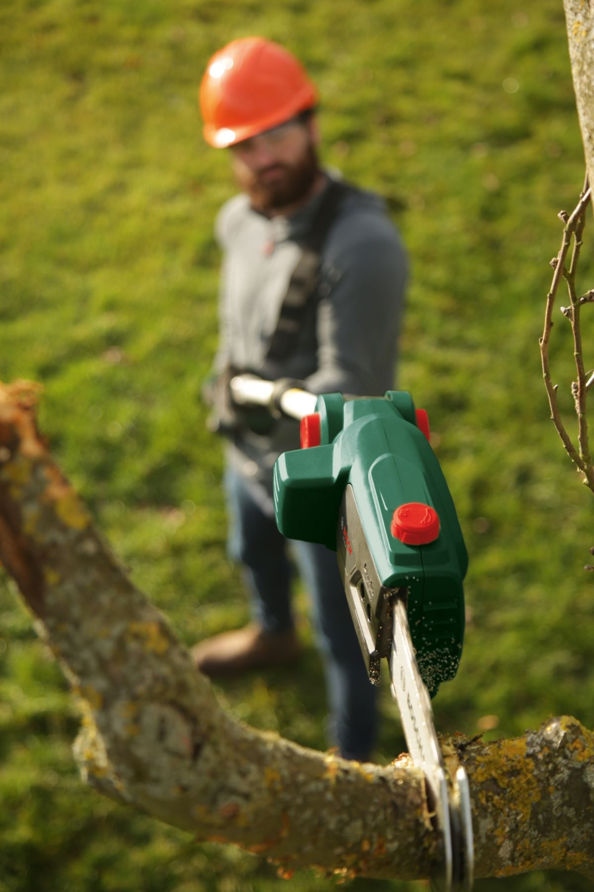 Beskær nemt grene fra jorden uden brug af stige. UniversalChainPole 18 gør det nemt at beskære på steder, du ellers ikke ville kunne nå, ved hjælp af teleskopstangen og drejehovedet. Det velafbalancerede design med lav vægt minimerer belastningen af arme og skuldre, og spidsbeskyttelsen og stødpiggen giver optimal kontrol under skæring og underskæring. Den automatiske kædesmøring og olieniveauindikatoren sikrer driftsstabilitet i værktøjet og ens resultater. Brug UniversalChainPole 18 med batteri til uafbrudt beskæring uden at beskadige træet. Værktøjet er en del af POWER FOR ALL ALLIANCE. Ét batteri kan bruges til en lang række værktøjer fra forskellige producenter.