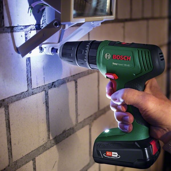 Den batteridrevne EasyImpact 18V-40-kombiboremaskine er det fleksible allround-værktøj til en lang række bore- og fastgørelsesopgaver. Den er udstyret med en 2-trins-gearkasse til hurtig boring og kraftfuld skruning, mens de 20 momentindstillinger giver maksimal skruepræcision. 13 mm-borepatron med én ring sikrer nem udskiftning af bor og bits. Takket være det ergonomiske design og det indbyggede LED-lys arbejder du effektivt og komfortabelt selv på steder med dårlig belysning. Denne maskine er det oplagte valg, når du arbejder med træ, metal, plast eller mursten.