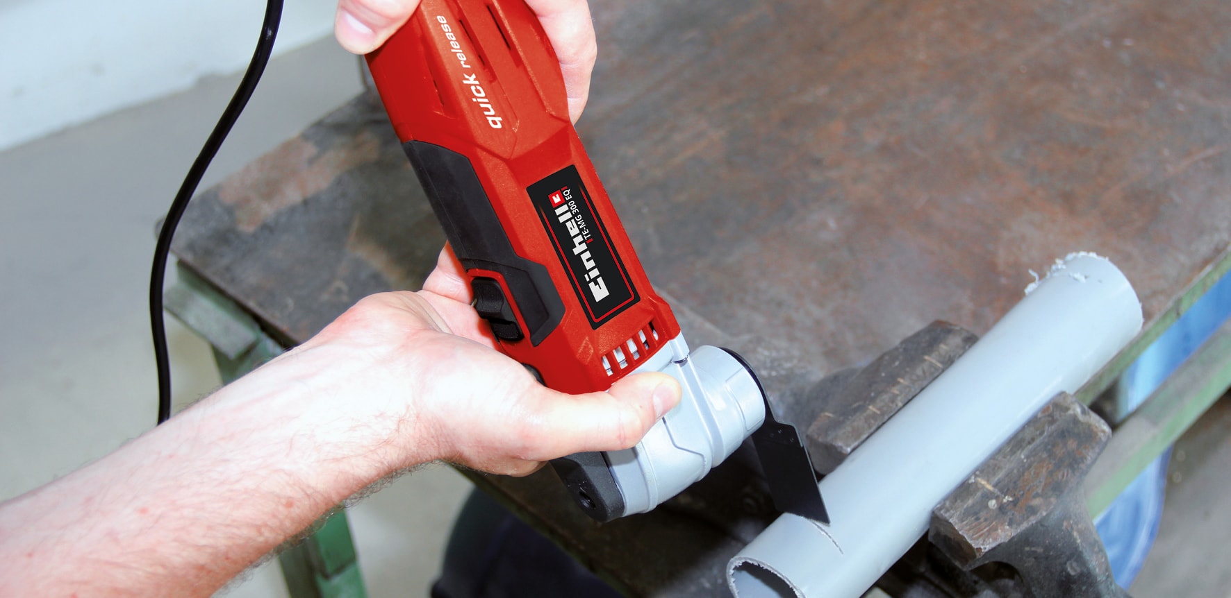 Multisliber fra Einhell med elektronisk omdrejningstal, konstant-elektronik, softgrip, snaplås, magnetisk værktøjsholder, trekant slibeplade, skavjern og støvudsugningsadapter.