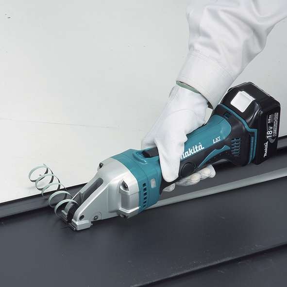 Akku pladesaks til ligeklip og kurvede snit med en skæreradius på 250 mm, skærer bånd med rene kanter fra midten. Skærekapacitet for aluminium er 2,5 mm og for stål 1,6 mm. Værktøjet har et slagantal på 4.300 min-1. Leveres uden batteri og lader.