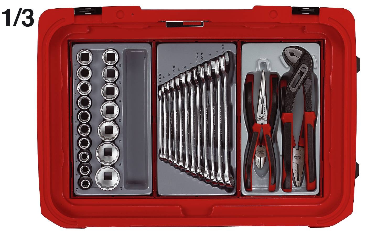 Den praktiske værktøjskuffert er udstyret med et praktisk håndtag, der gør det nemt at have værktøjet med rundt.