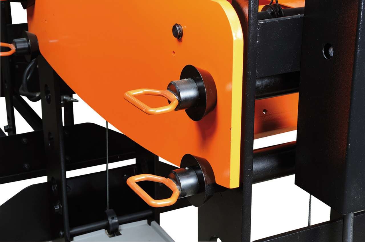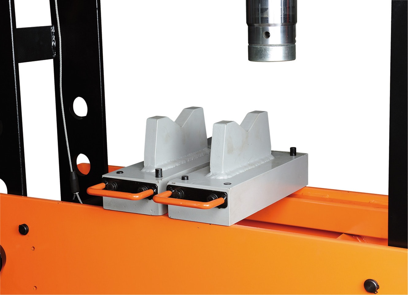 - Hydraulisk presse med dobbelt hastighed, der kontrolleres med en fodpedal og har indbygget sikkerhedsventil mod overbelastning