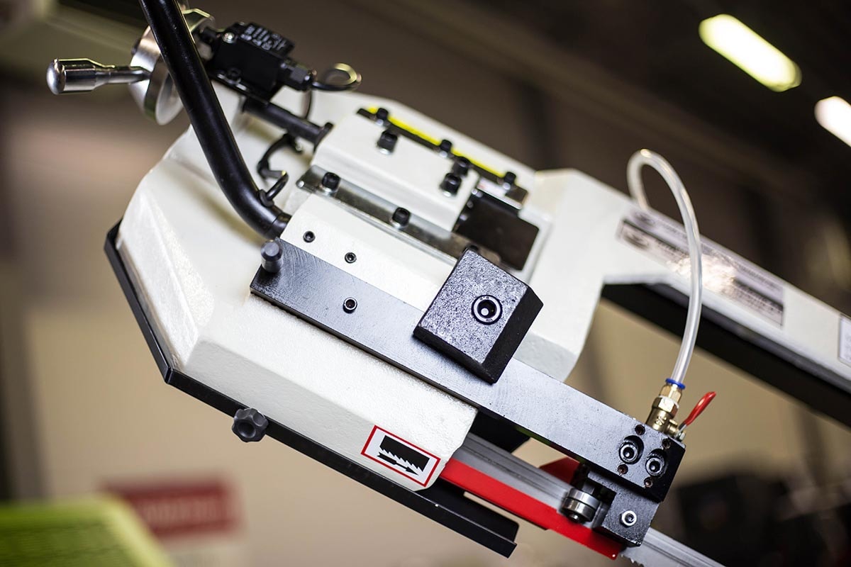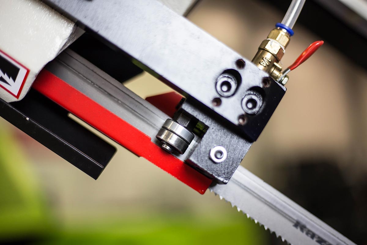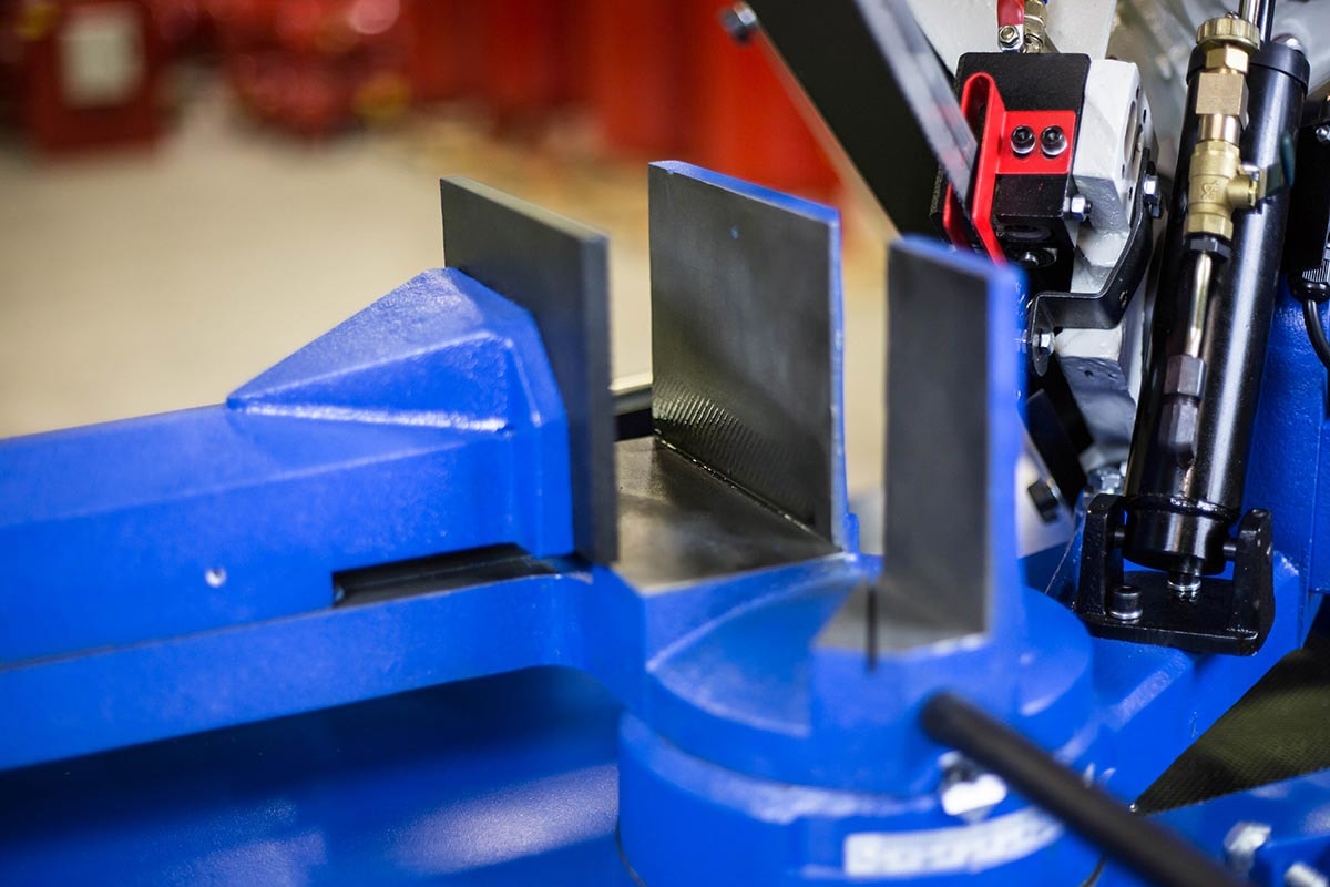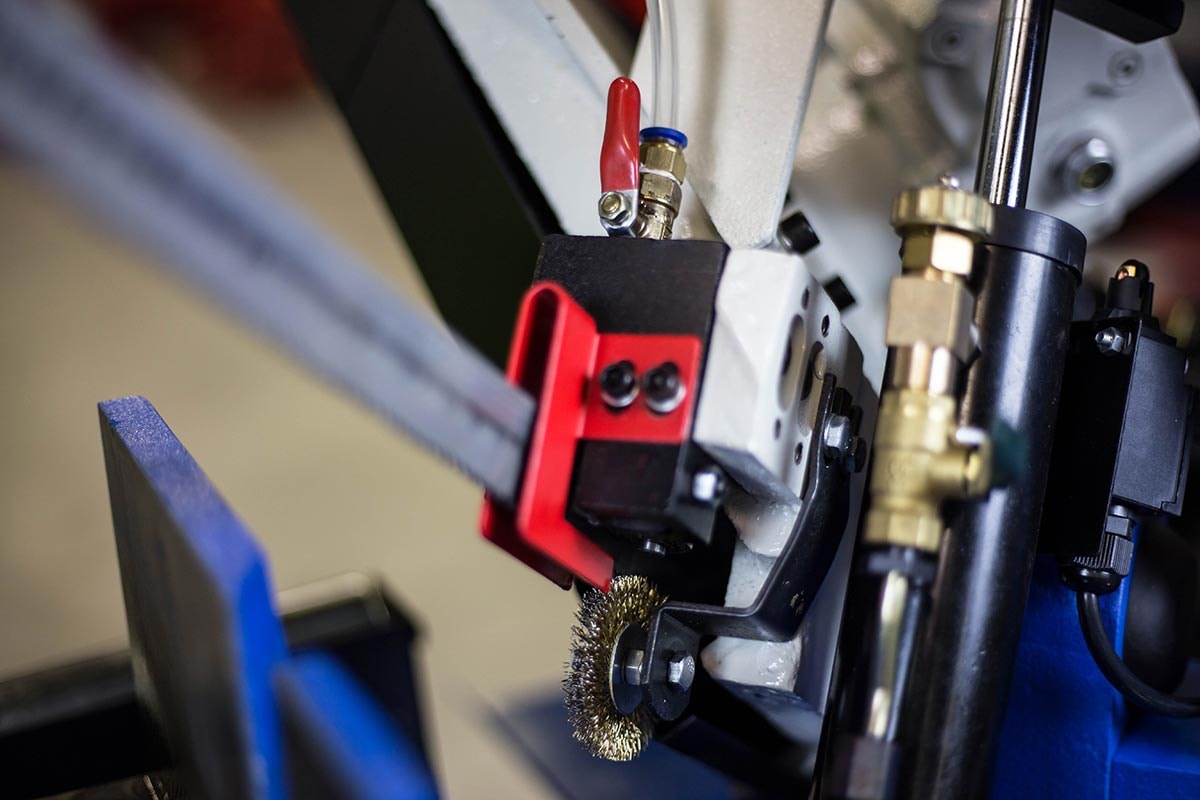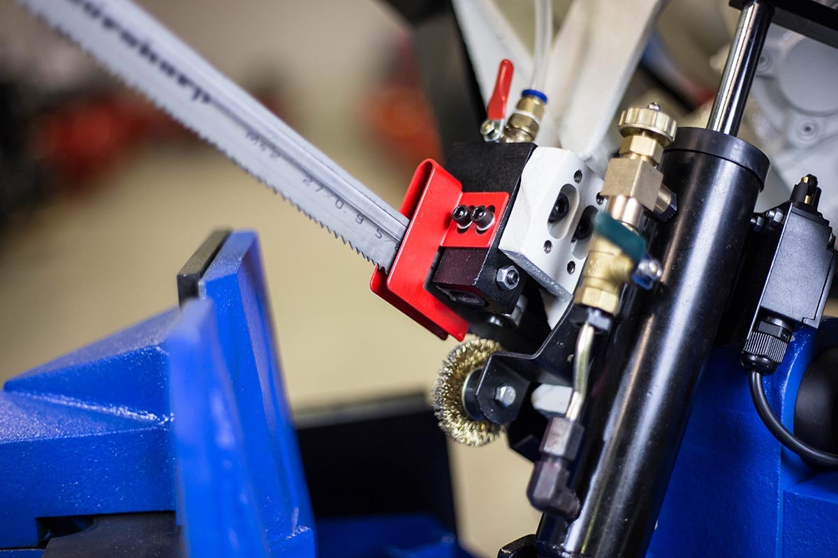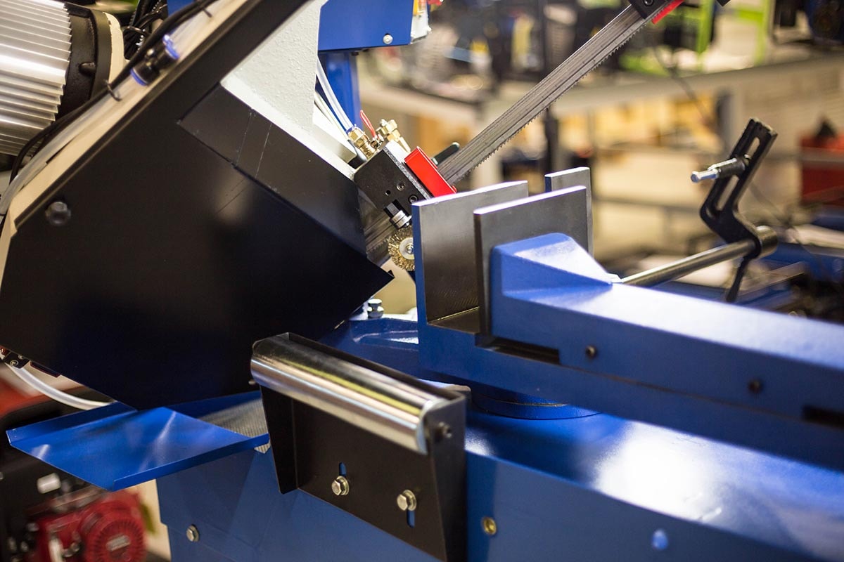 Halvmanuel båndsav, hvilket betyder manuel løft af savbøjlen og sænkning af savbøjlen via hydraulisk stempel og styreventil. Savbøjle geringsbar 0-60 grader, låses med håndtag. Automatisk nedlukning af motoren, når arbejdscyklussen er afsluttet. Hurtig justering af skruestik. Længdeanslag med materialestop. Savmotor med to hastigheder. Driftsspænding 24 volt. Maskinen er udstyret med en klingespændingsanordning med indikator, gearkasse og kølevæskeudstyr. Leveres komplet med stativ, savklinge og kølevandspumpe.