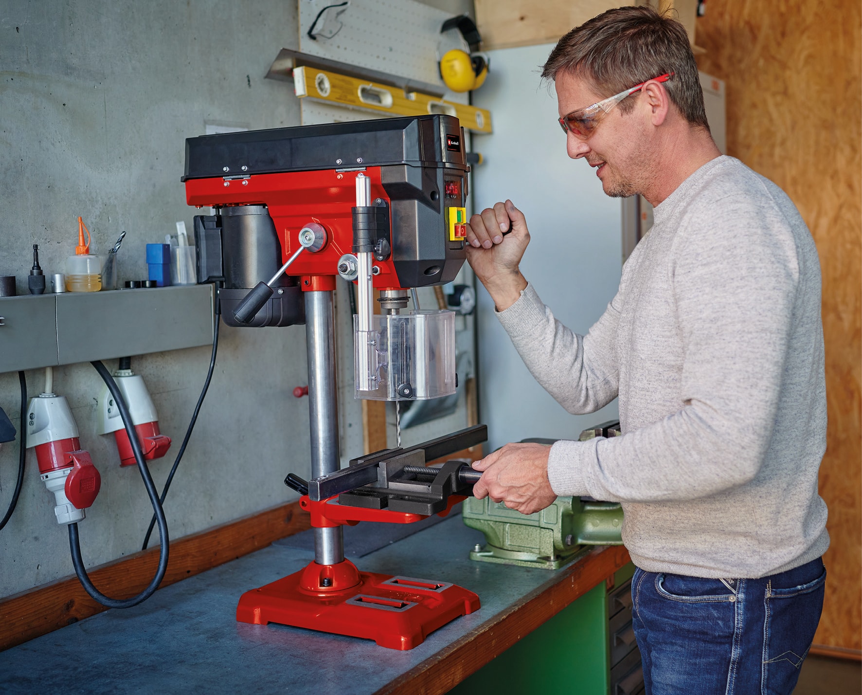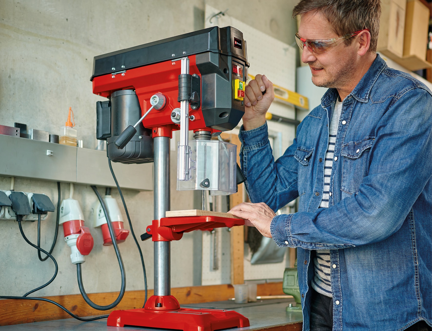 Borebordet kan også justeres i højden, vippes og roteres for at muliggøre en optimal arbejdsgang - ligesom dybdestoppet kan justeres for at muliggøre præcis boring i serier. Einhell TE-BD 550 E søjleboremaskine med display 550W har borespindel med kuglelejer, hvilket sikrer en lang levetid, samt en smart beskyttelsesskærm, der giver dig ekstra beskyttelse og fuldt udsyn over arbejdsemnet.