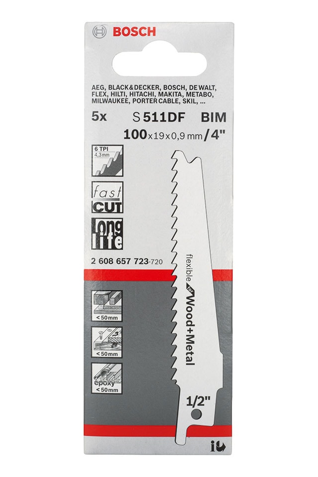 S 511 DF Flexible for Wood and Metal-bajonetsavklingen giver hurtige snit i træ og metal. Den store tandhøjde (4,3 mm) og udlagte tandform sikrer hurtige snit. Desuden er BIM-klingen (bimetal) er optimeret til at skære gennem bløde søm, bløde stålmaterialer og jernfrie metalkomponenter, der er indlejret i træ. Dens korte længde (100 mm) giver en skærekapacitet på op til 50 mm og gør den ideel til brug med kompakte akku-save.