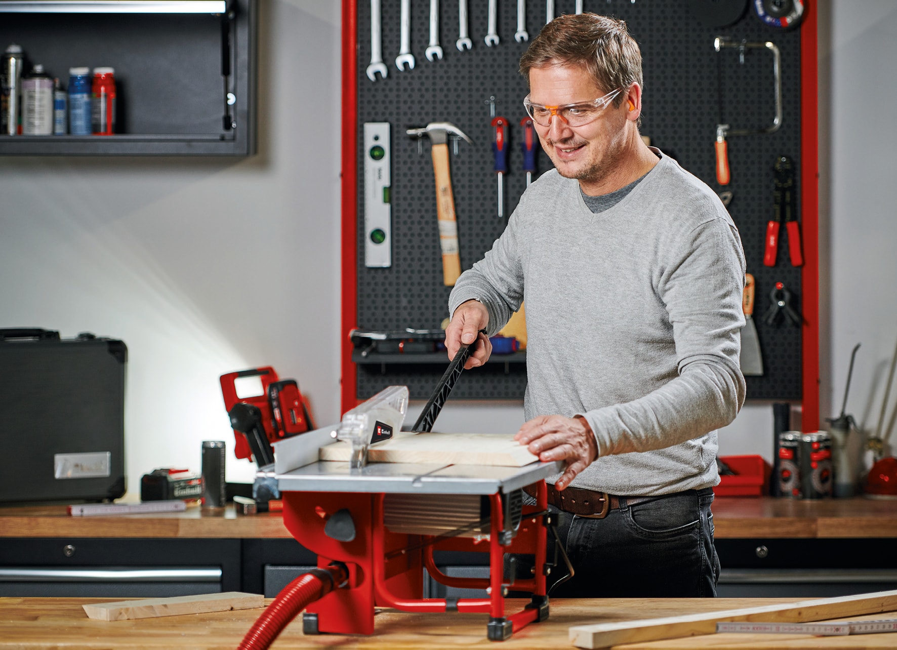 Karbidsavklingen giver altid rene stærke snit. Af sikkerhedshensyn medfølger en skubbepind, som har sin egen holder på bordrundsaven, så den altid er inden for rækkevidde.