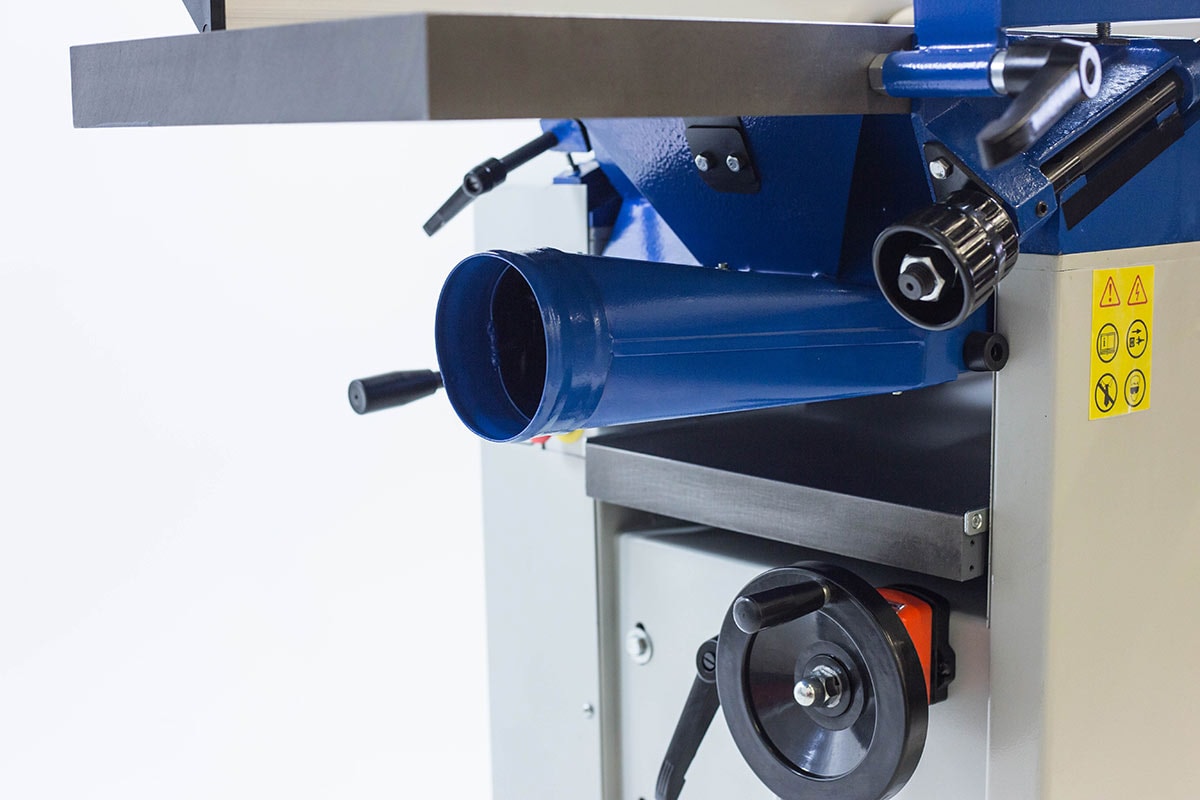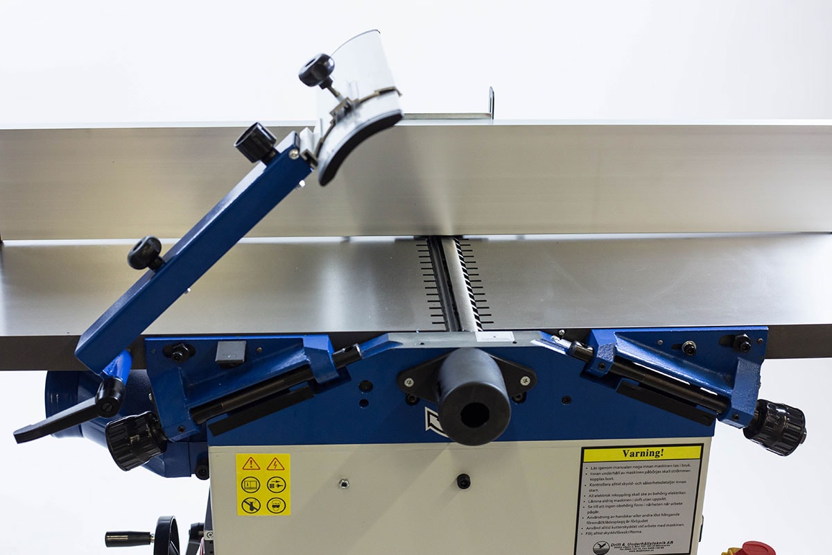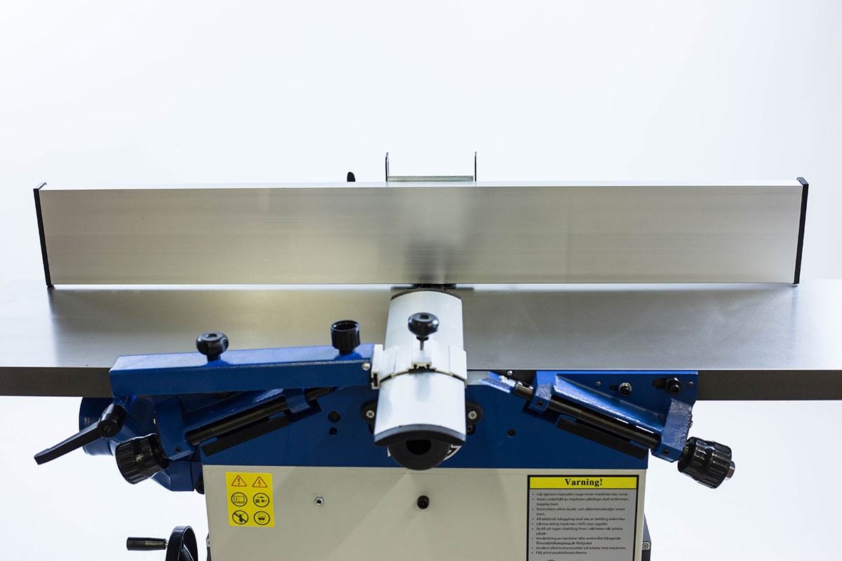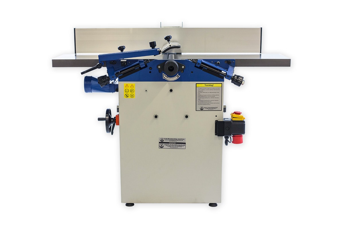 Kraftig afretter- og planhøvl med robust svejset stålstel og støbejernsbord. Maskinen har en trefaset elmotor på 3 hk til at klare tungt arbejde, fremføringsvalserne og udløbsvalsen er af stål. Høvlen leveres komplet med spånplader, stolpeværktøj til høvlstålet og digitale hænder af gulvhøjden. For at skifte fra afretter- til planhøvling fjernes begge borde for maksimal sikkerhed og overblik over emnet. Den solide fræser, som er 75 mm i diameter, er udstyret med 3 høvlstål for det bedste resultat. Stoppet kan vinkles fra 0° - 45° for at muliggøre de fleste høvlemomenter, der kan forekomme.