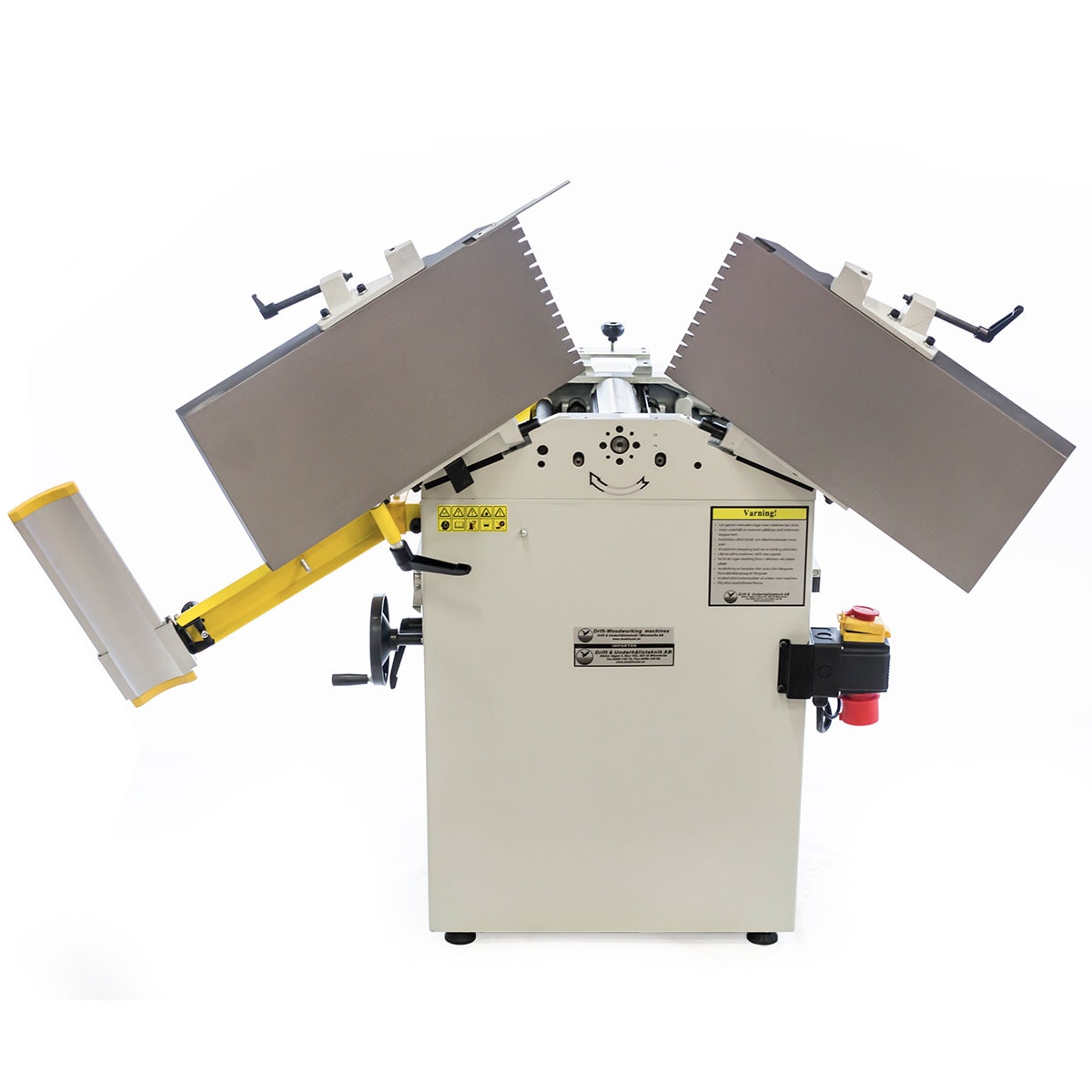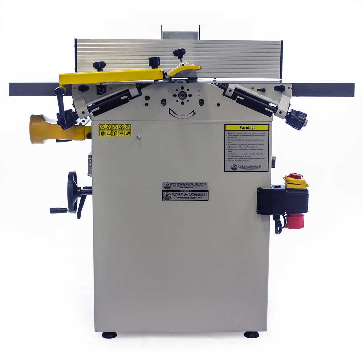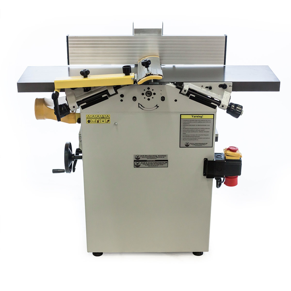 Robust afretter og tykkelseshøvl udstyret med 400 volt 3 hk elmotor, støbejernsbord (afretterbord og niveaubord) og fremføringsruller af stål. Maskinen leveres med spånstudser og slibbare høvlestål (3 stk.) i højhastighedsstål. Niveaubordet hæves og sænkes med en midterstolpe til det ønskede niveau. Højden indstilles med betjeningsknappen og gradueret mm-skala. Afretterbordet bøjes høvling (se billede). En robust afretter og tykkelseshøvl velegnet til skoler, mindre snedkerværksteder, hobby, hjemmetømrer m.m.