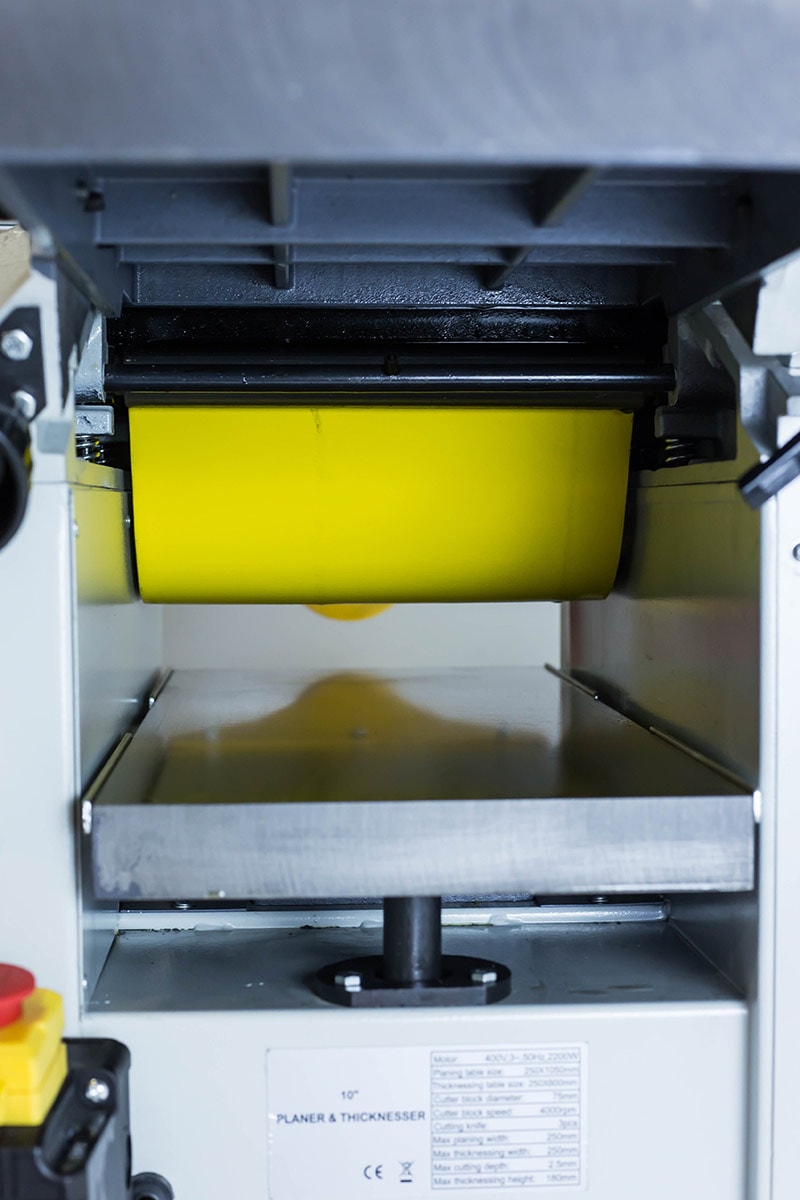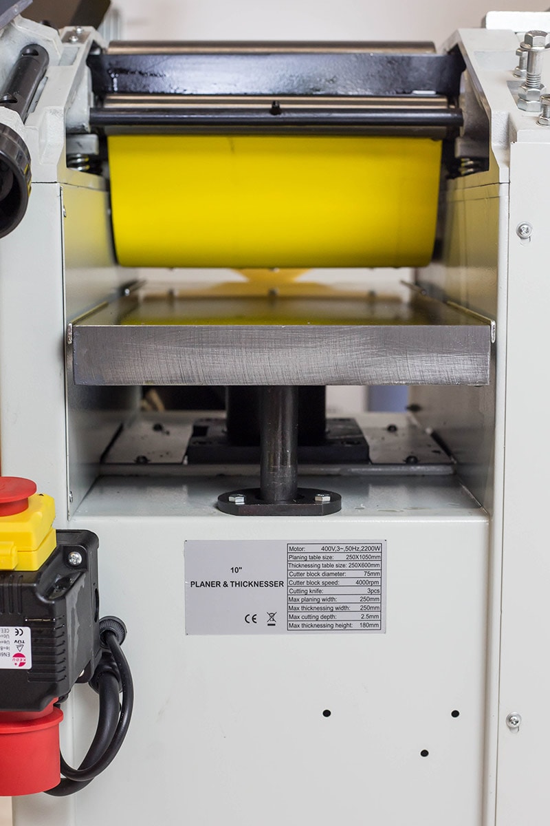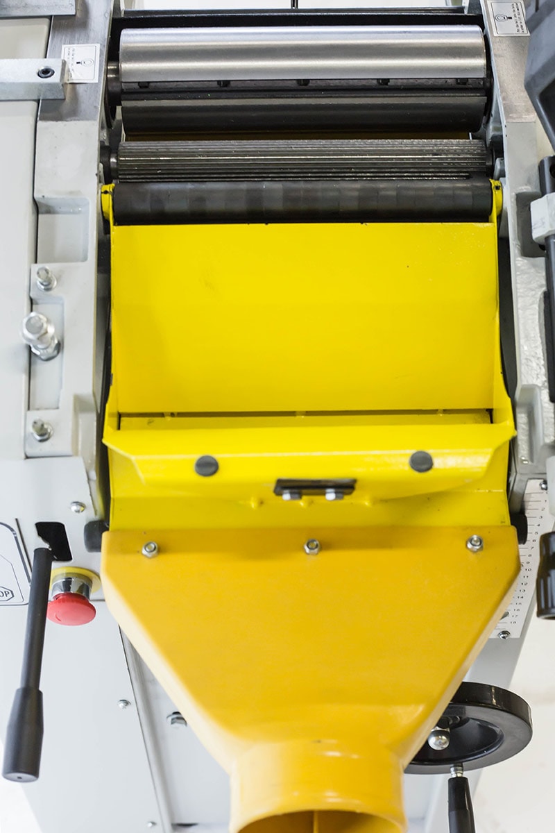 Robust afretter og tykkelseshøvl udstyret med 400 volt 3 hk elmotor, støbejernsbord (afretterbord og niveaubord) og fremføringsruller af stål. Maskinen leveres med spånstudser og slibbare høvlestål (3 stk.) i højhastighedsstål. Niveaubordet hæves og sænkes med en midterstolpe til det ønskede niveau. Højden indstilles med betjeningsknappen og gradueret mm-skala. Afretterbordet bøjes høvling (se billede). En robust afretter og tykkelseshøvl velegnet til skoler, mindre snedkerværksteder, hobby, hjemmetømrer m.m.