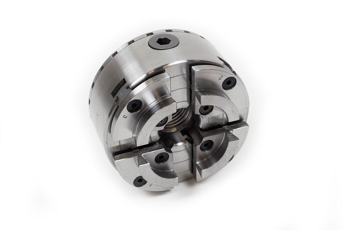 Selvcentrerende 5" drejepatron til indvendig og udvendig fastgørelse beregnet til runde og kantede materialer beregnet til trædrejebænke. Denne 4 bagpatron af høj præcision er selvcentrerende, hvilket betyder, at det er meget nemt at montere emnet. Standardpatronen er udstyret med et spindelgevind M33x3,5.