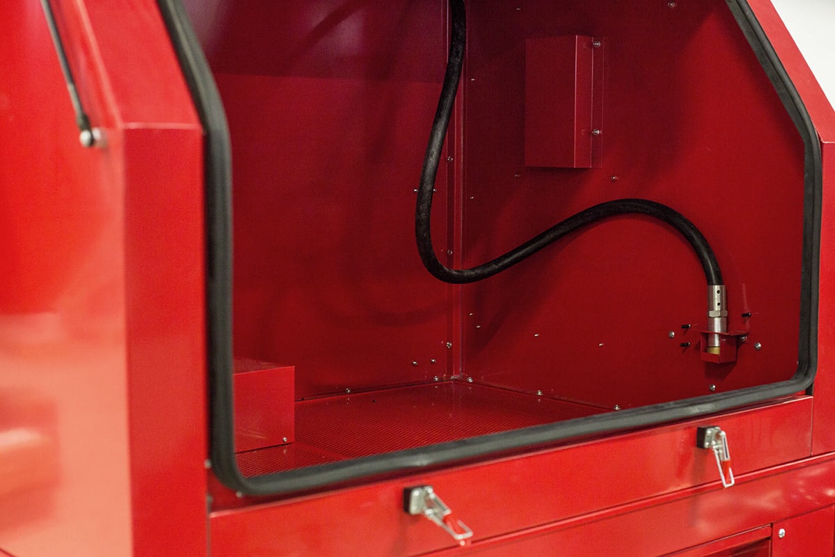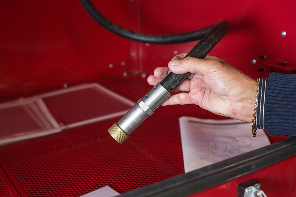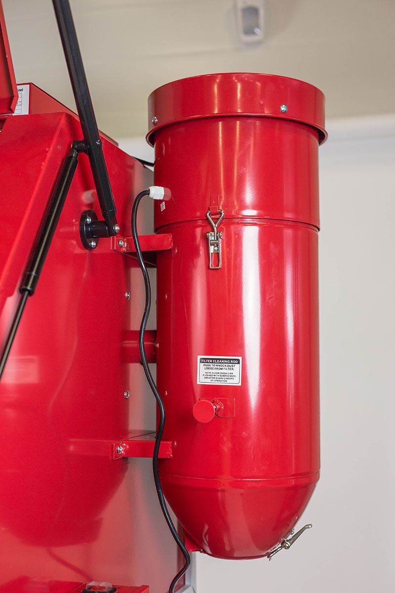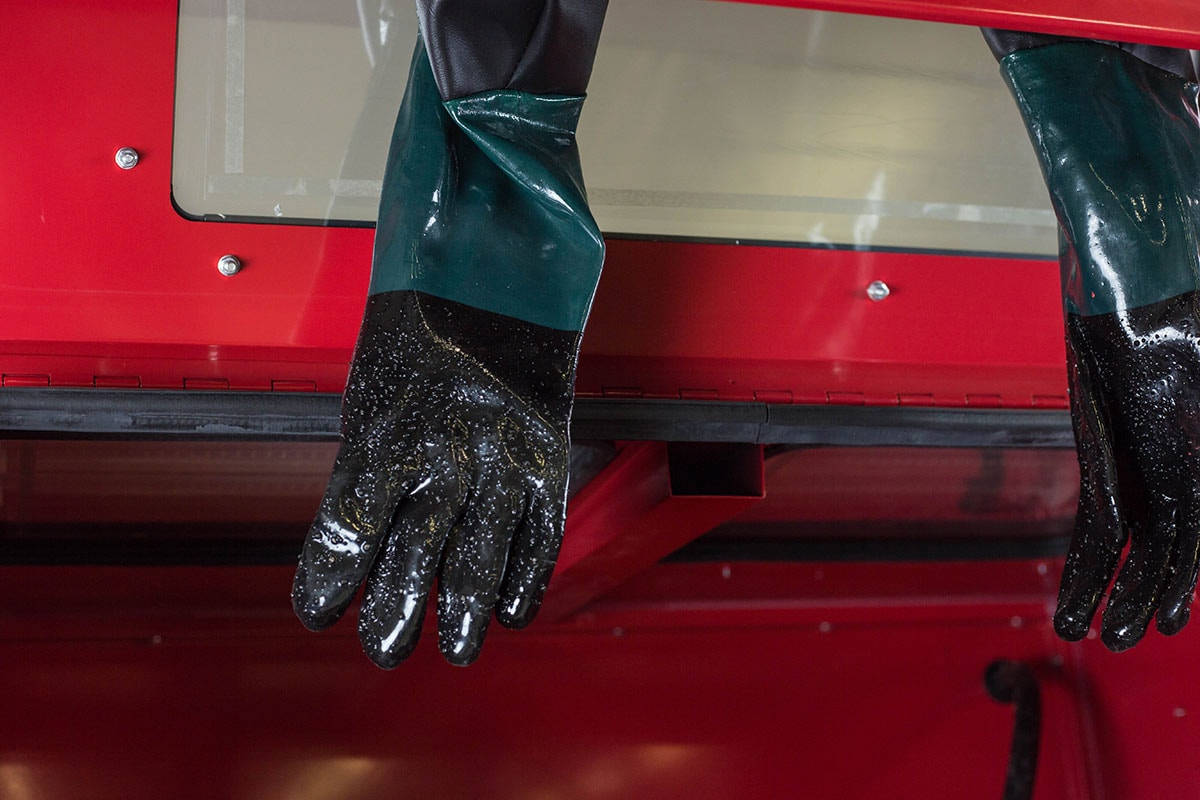 Professionelt blæseskab med tryktank, som muliggør højere blæsetryk for markant højere effekt på materialet, der skal blæses. Skabet er udstyret med en oplukkelig hoveddør, der holdes åben ved hjælp af gasfjedre for nem af- og pålæsning af godset og dobbelte udsugningsventilatorer med integrerede filtre for bedst udsyn og rengøring. Skabet er desuden udstyret med et kraftigt blæsehåndtag med keramisk dyse for optimal holdbarhed.