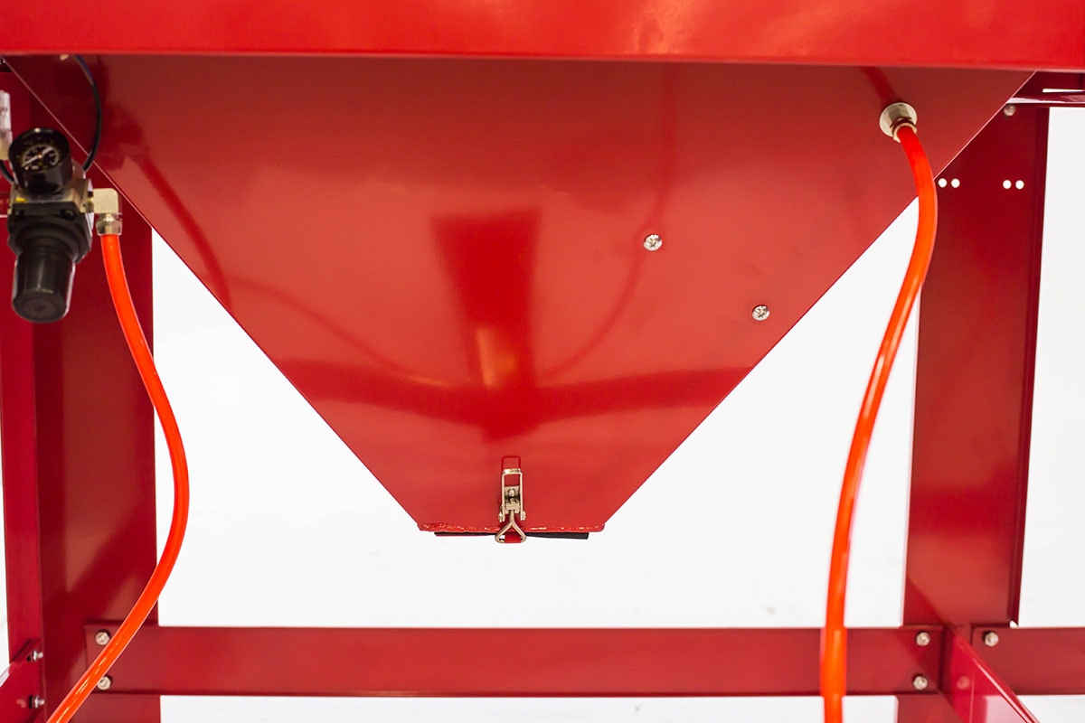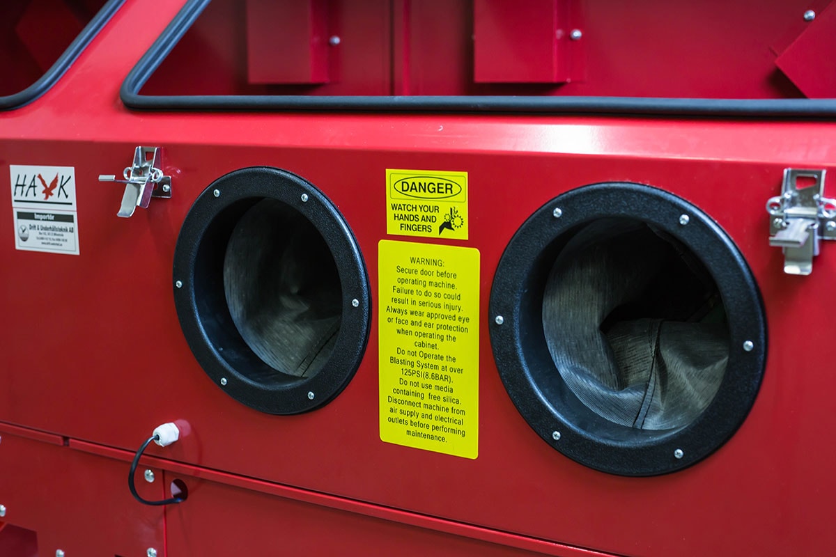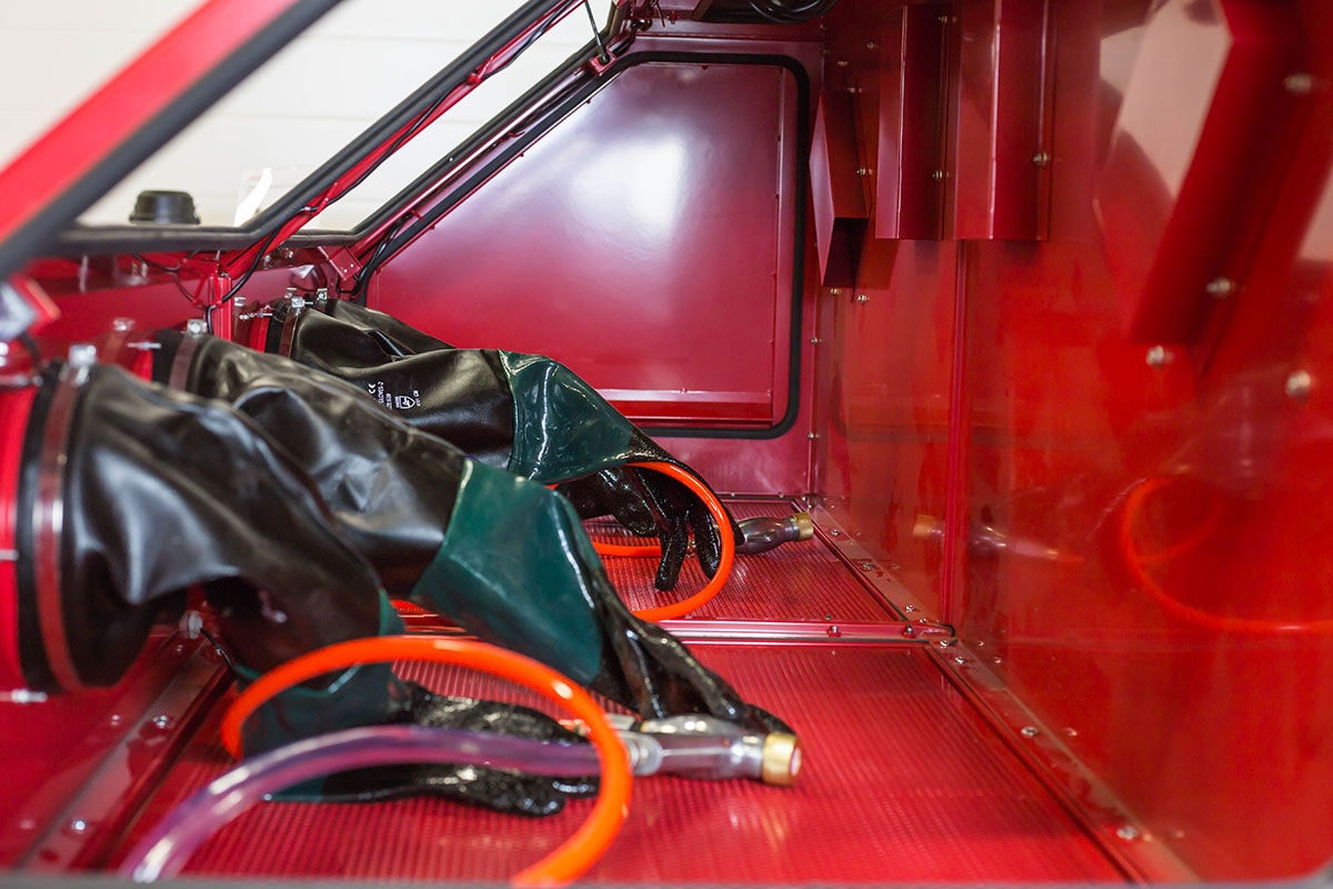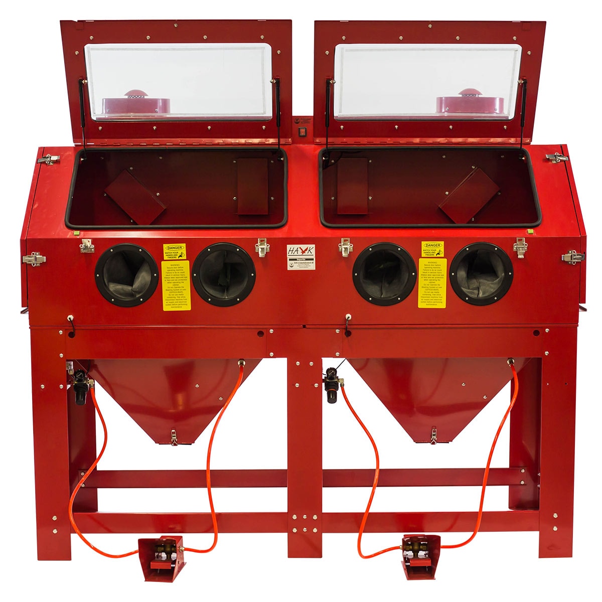 Kraftfuldt blæseskab af industrimodel på hele 880 liter. Dette ekstra store blæseskab er udstyret med to parallelle arbejdsstationer, to oplukkelige fordøre og to oplukkelige sidedøre, hvilket gør det nemt og bekvemt at indsætte og fjerne emner, der skal bearbejdes. Skabet er udstyret med blæsehandsker, to blæsepistoler og to udsugningsventilatorer, som muliggør optimalt udsyn i skabet under arbejdet. på grund af at blæseskabet er udstyret med to forskellige stationer, er det muligt at bruge to forskellige blæsemidler i samme skab uden at skulle tømme ud og skifte blæsemidler. Skabet er også udstyret med robuste fodpedaler, der styrer de ventiler, der frigiver blæsemidlet til blæsepistolerne.