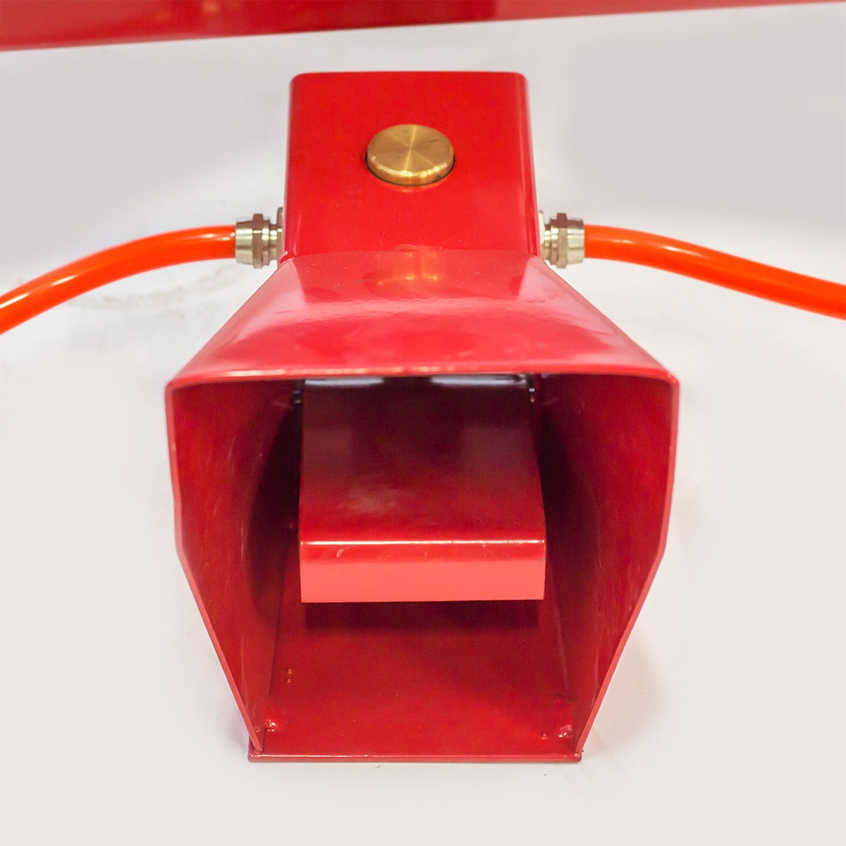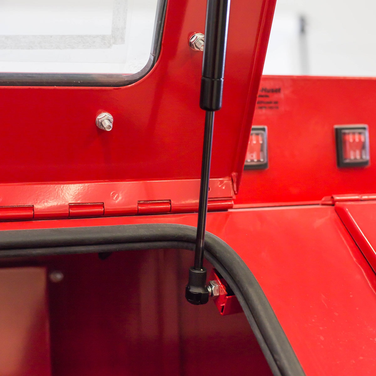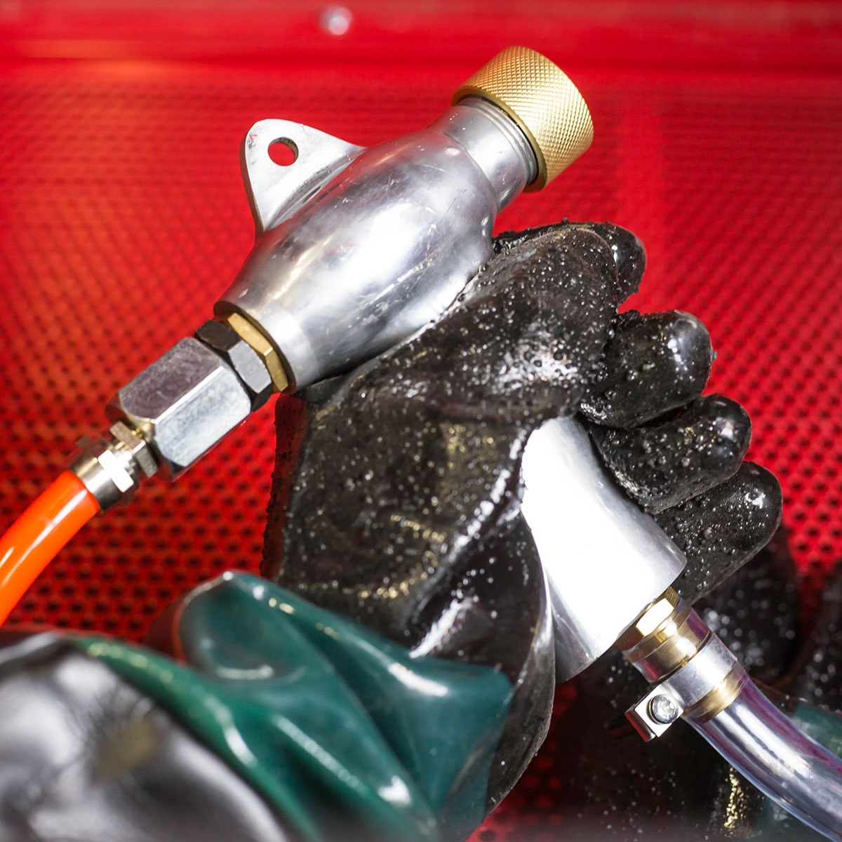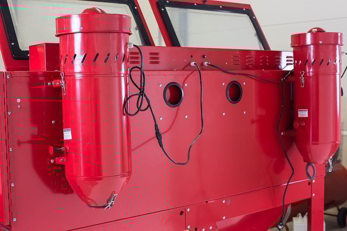 Kraftfuldt blæseskab af industrimodel på hele 880 liter. Dette ekstra store blæseskab er udstyret med to parallelle arbejdsstationer, to oplukkelige fordøre og to oplukkelige sidedøre, hvilket gør det nemt og bekvemt at indsætte og fjerne emner, der skal bearbejdes. Skabet er udstyret med blæsehandsker, to blæsepistoler og to udsugningsventilatorer, som muliggør optimalt udsyn i skabet under arbejdet. på grund af at blæseskabet er udstyret med to forskellige stationer, er det muligt at bruge to forskellige blæsemidler i samme skab uden at skulle tømme ud og skifte blæsemidler. Skabet er også udstyret med robuste fodpedaler, der styrer de ventiler, der frigiver blæsemidlet til blæsepistolerne.