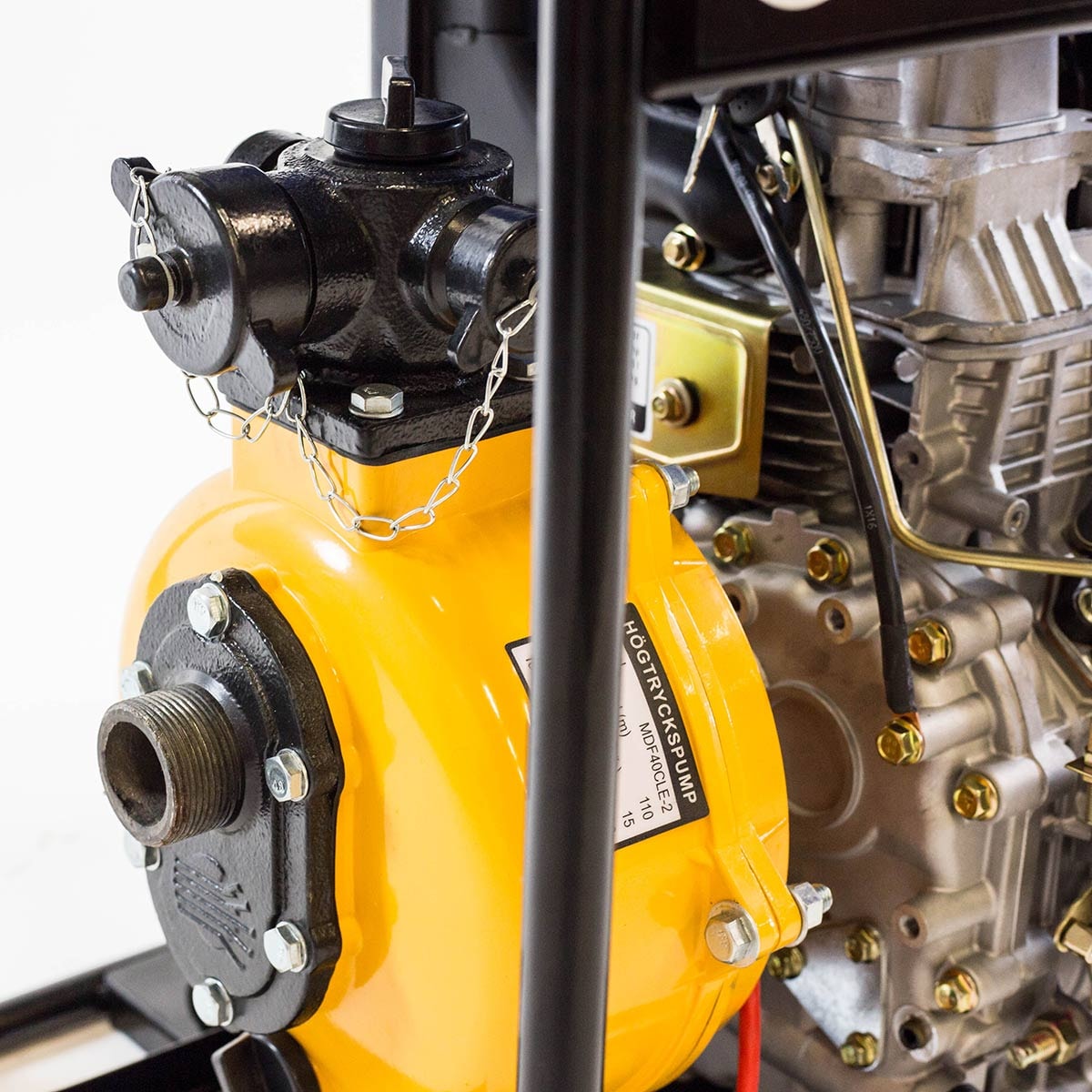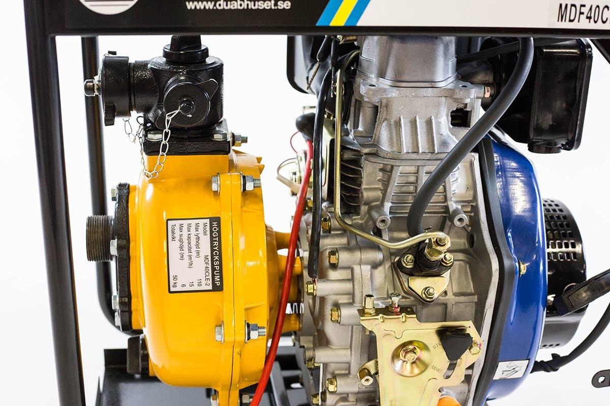 DUAB-POWER MDF40CLE-2 er en dieseldrevet højtrykspumpe udstyret med elektrisk start og stor brændstoftank. Pumpehus i aluminium med dobbelte stålhjul. To udtag og indbygget kontraventil. Leveres med startbatteri. Pumpen er fremragende som spulepumpe, brandslukning mm.