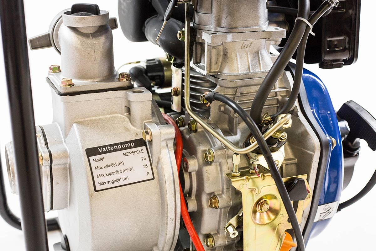 DUAB-POWER MDP50CLE er en dieseldrevet motorpumpe udstyret med el-start og stor tank. Maskinen leveres med startbatteri og slangetilslutninger. Aluminiumspumpehus med indbygget kontraventil. En pålidelig maskine til kunstvanding, drænarbejde mm.